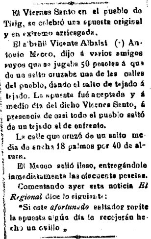 «Una apuesta original y en extremo arriesgada» se lleva a cabo en Tírig el Viernes Santo de 1900, 13 de abril, según informa Heraldo de Castellón unos días más tarde. El albañil Antonio Maceo -extrañamente también citado como Vicente Albalat– se juega con sus amigos nada menos que 50 pesetas «a que de un salto cruzaba una de las calles del pueblo, dando el salto de tejado a tejado». Aceptado el reto, a mediodía del día señalado, «a presencia de casi todo el pueblo saltó de un tejado al de enfrente», superando una distancia de 18 palmos (unos 3,60 metros) y evitando una caída que hubiera sido de nada menos que 40 palmos de altura (8 metros). Al quedar «ileso», le son entregadas de inmediato las 50 pesetas, según recoge el diario, quien también incluye en su breve crónica la valoración de otro periódico, El Regional: «algún día lo recogerán hecho un ovillo».