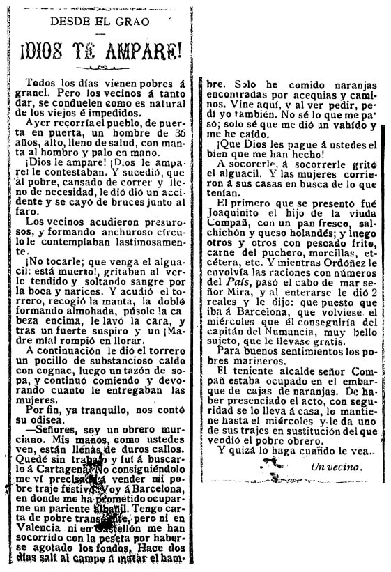 A finales de 1910, El Clamor se hace eco en este breve reportaje de un problema social: «todos los días vienen pobres a granel». Y pone como ejemplo la «odisea» particular de un obrero murciano que recorre la costa en busca de remedio para su miseria y acaba desmayado en el Grao de Castellón. El periódico detalla las muestras de solidaridad con que los graueros socorren al hombre, incluyendo un pasaje gratis de barco para trasladarse a Barcelona, donde «un pariente albañil» le ha prometido un empleo.
