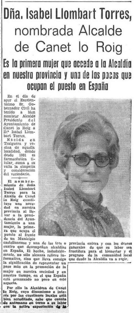 En la provincia de Castellón, un año más tarde, le llega el turno a la farmacéutica Isabel Llombart Torres, «nombrada Alcalde de Canet lo Roig» por el gobernador civil, José Fernández Ramírez, según publica Mediterráneo el último día de abril de 1970. Permanecerá en el cargo hasta 1974. Es la primera que accede al puesto en la provincia «y una de las pocas» que lo ostentan en el país en ese momento. El diario lo ve como «un paso más en la promoción de la mujer en nuestra sociedad y en nuestro tiempo, en el que España está avanzando no poco en este aspecto».
