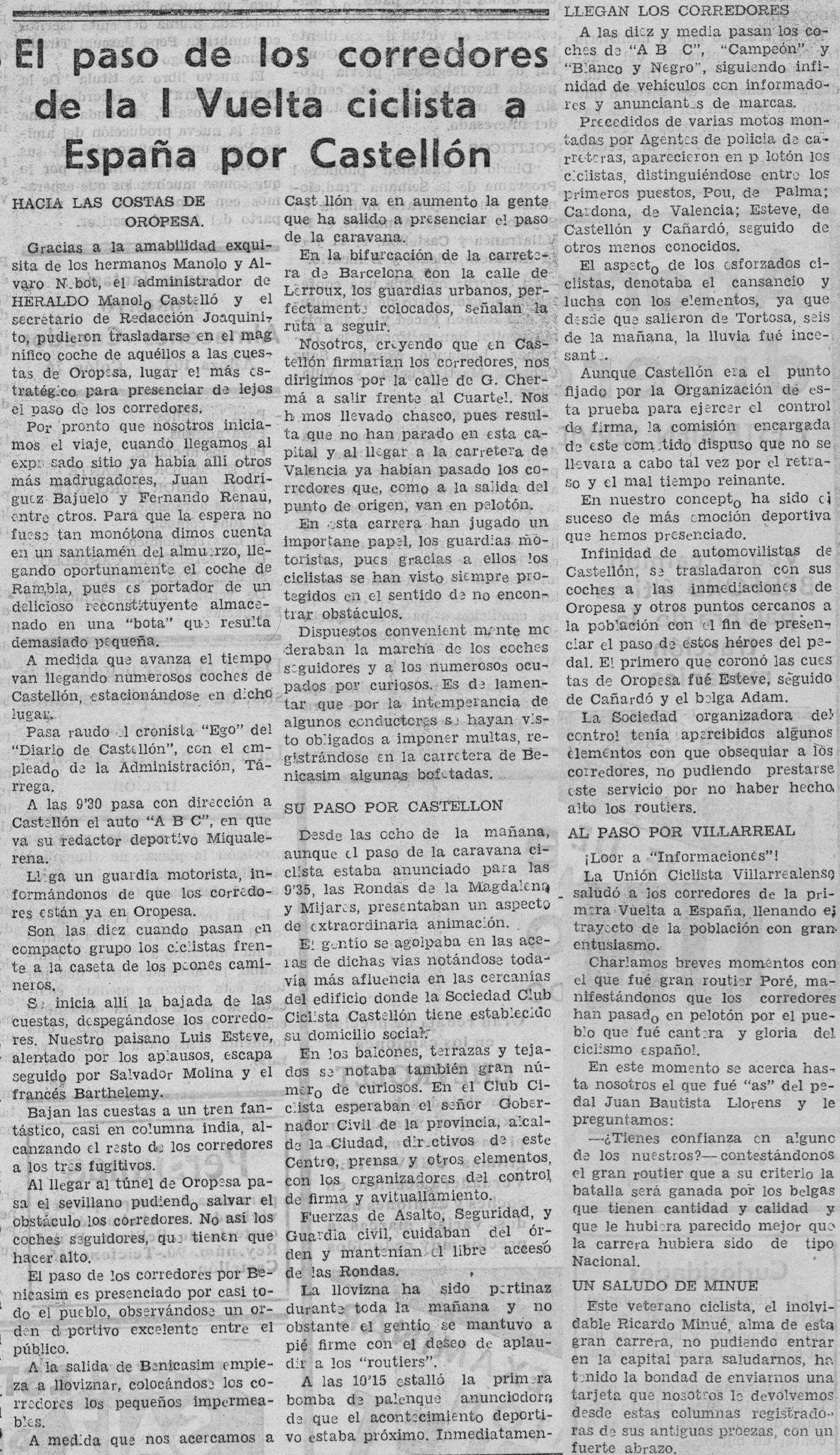 La octava etapa de la primera edición de la Vuelta Ciclista a España, organizada en 1935 por el diario Informaciones, recorre de Norte a Sur la provincia de Castellón, tras salir de Tortosa (Tarragona) y en su camino hacia la meta en Valencia. Heraldo de Castellón realiza una cobertura informativa acudiendo en primer lugar a las cuestas de Oropesa, el lugar «más estratégico para presenciar de lejos el paso de los corredores». Desde allí ven pasar «raudo» a Ego, Francisco Alloza Sirvent, cronista a su vez del Diario de Castellón, o al bilbaíno Jacinto Miquelarena, quien cubre la carrera para ABC. Los reporteros de Heraldo se llevan un chasco al creer que los ciclistas «firmarían» en Castellón y se lamentan porque «por la intemperancia de algunos conductores [los guardias] se hayan visto obligados a imponer multas, registrándose en la carretera de Benicàssim algunas bofetadas».