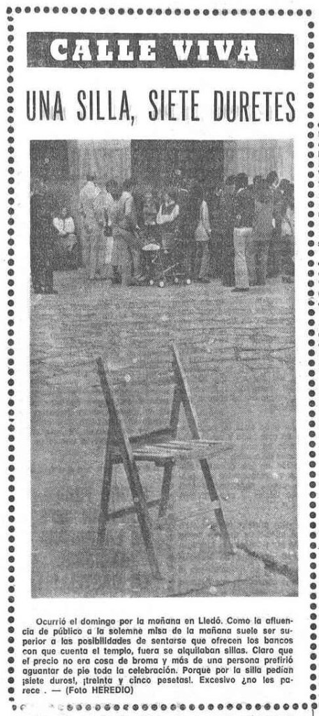 Tres días después de la fiesta mayor de la Patrona principal de la ciudad, la Mare de Déu del Lledó, Mediterráneo se refiere en tono irónico al precio alcanzado por el «alquiler» de una silla para la celebración, dado que la afluencia de fieles es «superior a las posibilidades de sentarse que ofrecen los bancos con que cuenta el templo», que dentro de tres años recibirá el título del Basilicato. «Más de una persona prefirió aguantar de pie toda la celebración. Porque por la silla pedían ¡siete duros! ¡treinta y cinco pesetas! Excesivo, ¿no les parece?», concluye el diario su denuncia, ilustrada por una imagen de Heredio Iserte. El precio del periódico en el mismo día asciende a 25 pesetas.