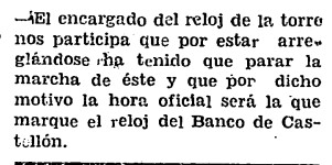 A mediados de mayo de 1935, Heraldo de Castellón da cuenta de una noticia que «participa» el encargado del «reloj de la torre» campanario. Según la breve nota, se ha tenido que «parar la marcha» del citado reloj con motivo de una reparación «y que por dicho motivo la hora oficial será la que marque el reloj del Banco de Castellón», en la Puerta del Sol. Son años en que dicha hora oficial es importante, por ejemplo, para marcar el horario de salida y llegada de los trenes en la estación del ferrocarril de la ciudad.