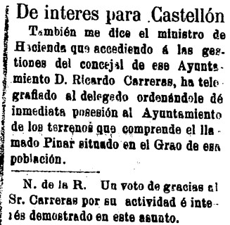 Una ley de 18 de marzo de 1900 excluye el Pinar del Grao del Catálogo de Montes Públicos, autorizando al Ayuntamiento de Castellón “para usar, aprovechar libremente y destinar a paseo público dicho Prado y Pinar del Mar, sin perjuicio de los usos comunales a que tienen derecho los vecinos según la real orden de 21 de septiembre de 1863”. Asimismo, establece que “el Estado percibirá el 20% del precio de los solares o parcelas que el Ayuntamiento haya vendido o enajene en lo sucesivo, haciendo uso de la autorización que se le concedió por real orden de 30 de julio de 1892.” En cumplimiento de dicha ley, el 26 de mayo de 1900, la Delegación provincial de Hacienda hace entrega de los terrenos al consistorio. Unos días antes, el 18 de mayo, El Regional publica una nota -escrita con una curiosa familiaridad- en la que se explica cómo el ministro de Hacienda, Raimundo Fernández Villaverde, le había comunicado a un cronista de Madrid la decisión tomada, «accediendo a las gestiones del concejal de ese Ayuntamiento D. Ricardo Carreras» Balado. La redacción del periódico acompaña la noticia de «un voto de gracias» al edil y escritor -que años más tarde será uno de los fundadores de la Societat Castellonenca de Cultura, «por su actividad e interés demostrado» en el asunto.