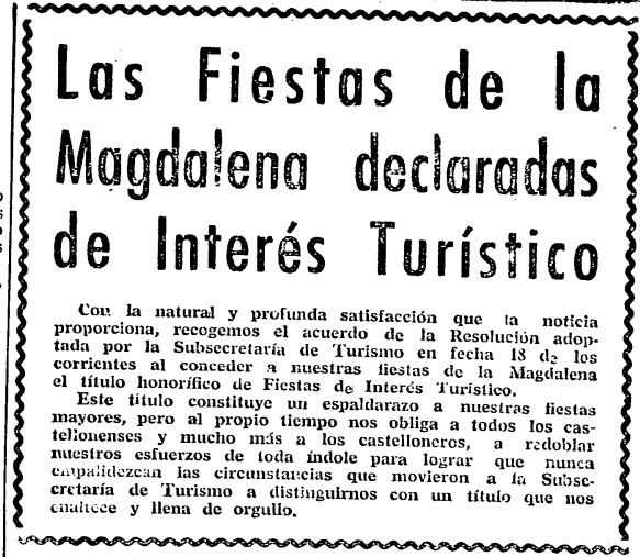 45 años antes de la declaración de las fiestas de la Magdalena como celebraciones de interés turístico internacional (2010), el Gobierno otorga a las festividades fundacionales de la ciudad de Castellón el título de interés turístico nacional. En mayo de 1965, Mediterráneo anuncia la concesión de la distinción «con la natural y profunda satisfacción que la noticia proporciona», acogiéndola «como un espaldarazo a nuestras fiestas mayores».