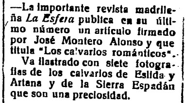 El artículo referido, de tintes líricos, se publica en el semanario La Esfera y lleva la firma de José Montero Alonso, escritor y periodista, como parte de un serial titulado Por los caminos de España: