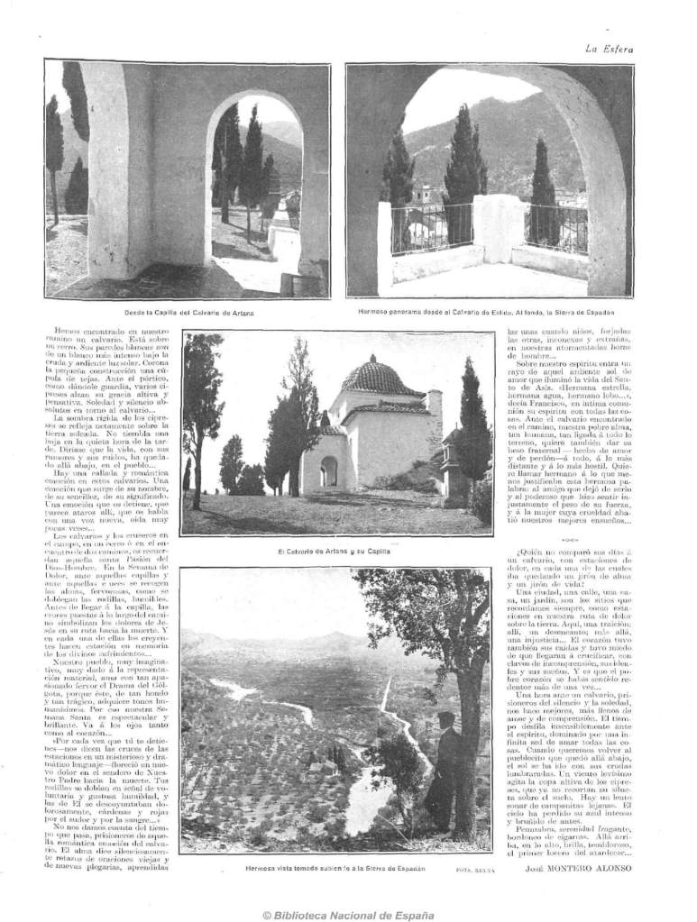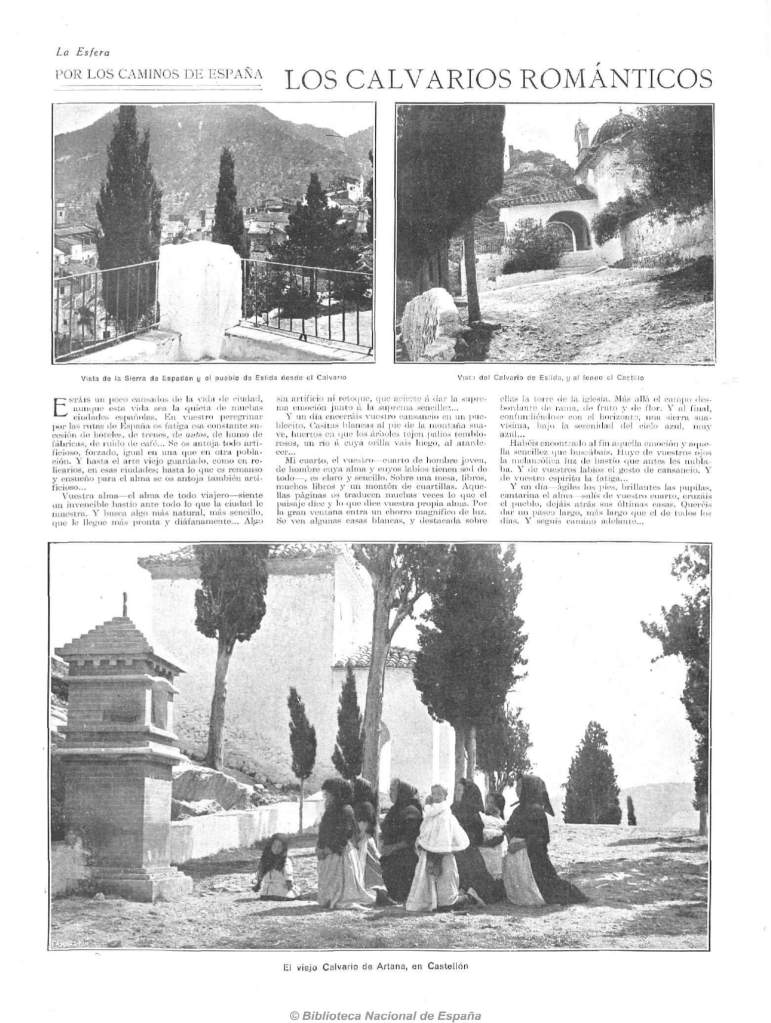 A fianles de mayo de 1925, Heraldo de Castellón se hace eco de la publicación, en una «importante revista madrileña», de un artículo titulado Los calvarios románticos que incluye varias fotografías de los calvarios de Eslida y Artana, así como de la Sierra Espadán.