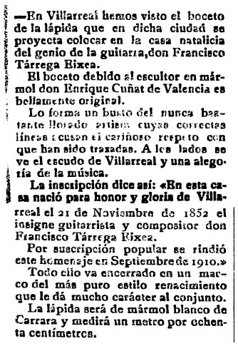 Cuatro meses antes de la colocación de una lápida conmemorativa en la casa natal del guitarrista y compositor Francisco Tárrega Eixea, Heraldo de Castellón recoge la noticia de la llegada a Vila-real del boceto «bellamente original» elaborado por «el escultor en mármol Enrique Cuñat de Valencia».