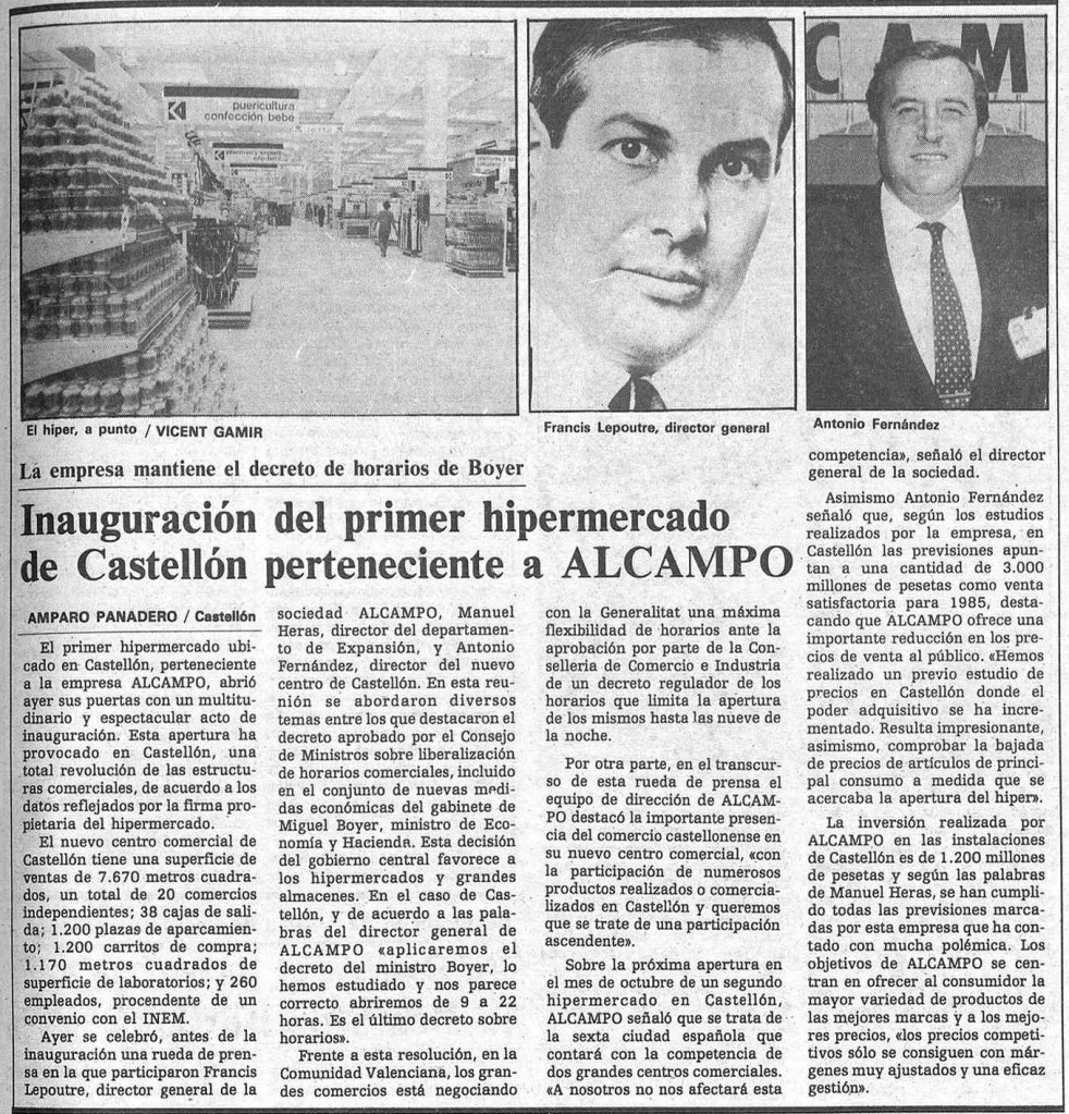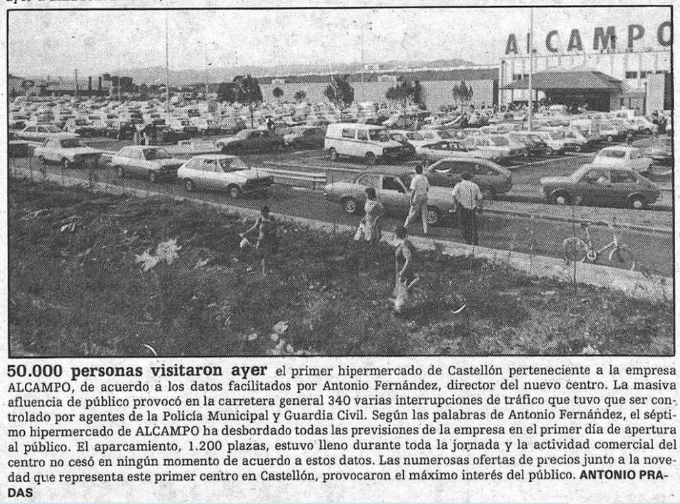 El lunes 27 de mayo de 1985 es un día para la historia económica de Castellón. Esa tarde, el hipermercado Alcampo acoge «un multitudinario y espectacular acto de inauguración» que simboliza «una total revolución de las estructuras comerciales» de la ciudad, según proclama la empresa y recoge Amparo Panadero en Mediterráneo. Con una inversión de 1.200 millones de pesetas, 7.670 metros cuadrados, 38 cajas de salida, 1.200 plazas de aparcamiento y 260 empleados, se trata del primer hipermercado de la ciudad, meses antes de que se abra Pryca -hoy Carrefour- a solo unos kilómetros de distancia, en otro lugar del término municipal.