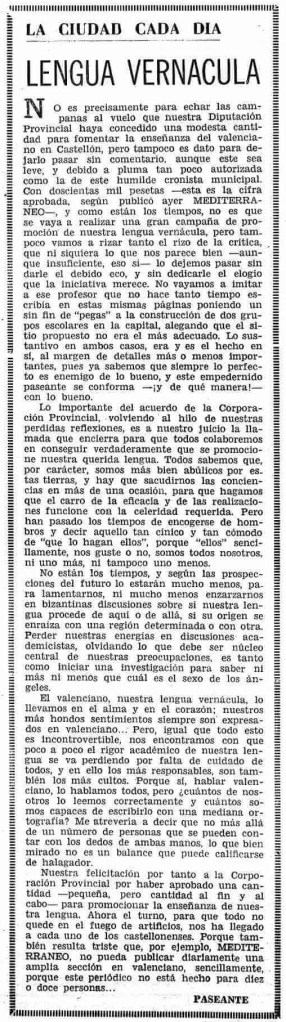 A finales de mayo de 1975, seis meses antes de la muerte del dictador Francisco Franco, la Diputación Provincial de Castellón concede «una modesta cantidad» -200.000 pesetas, cuando el periódico se vende a 8- para «fomentar la enseñanza del valenciano», como recoge en Mediterráneo este artículo de Paseante -seudónimo del director, Carlos Briones. El articulista alaba el acuerdo de la corporación provincial presidida por Francisco Albella Redó, tomándolo como una «llamada» para que «todos colaboremos en conseguir verdaderamente que se promocione nuestra verdadera lengua» y termina con una llamativa frase: «resulta triste que, por ejemplo, Mediterráneo no pueda publicar diariamente una amplia sección en valenciano, sencillamente, porque este periódico no está hecho para diez o doce personas».