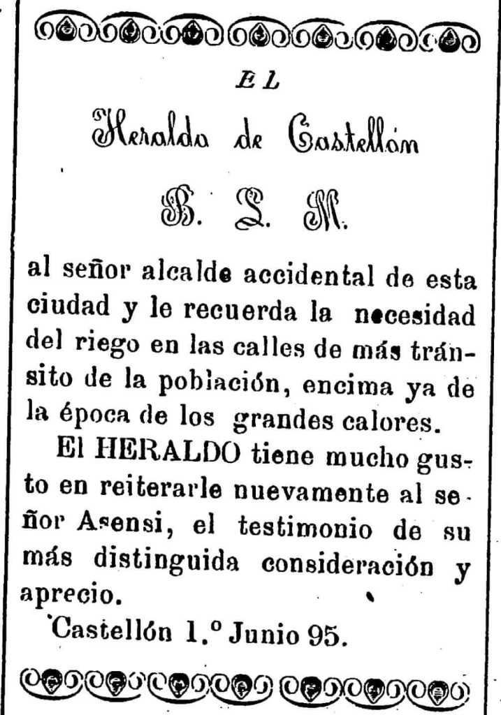 El primer día de junio de 1895, Heraldo de Castellón publica en su sección de información local una nota breve en formato de besalamano (B.S.M.) dirigida al alcalde accidental de la ciudad en sustitución de Eliseo Soler Breva: el primer teniente de alcalde, Mateo Asensi Giménez. En concreto, «le recuerda la necesidad del riego en las calles de más tránsito de la población, encima ya de la época de los grandes calores». La importancia de este baldeo se asoma de forma habitual a las páginas de la prensa.