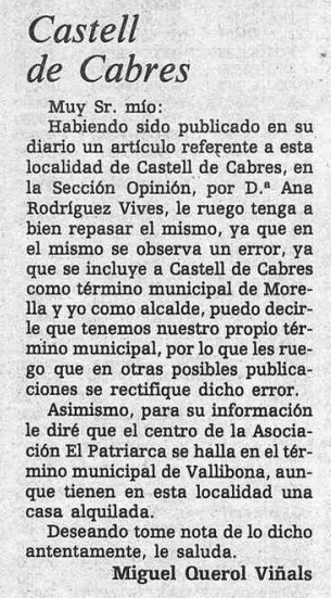 Miguel Querol Viñals, alcalde socialista de Castell de Cabres envía, a comienzos de junio de 1985, una carta al director de Mediterráneo, para responder a un artículo de opinión de Ana Rodríguez Vives. La respuesta viene motivada porque en el citado texto «se observa un error», al incluirse la población «como término municipal de Morella». «Yo como alcalde, puedo decirle que tenemos nuestro propio término municipal, por lo que les ruego que en otras posibles publicaciones se rectifique dicho error.