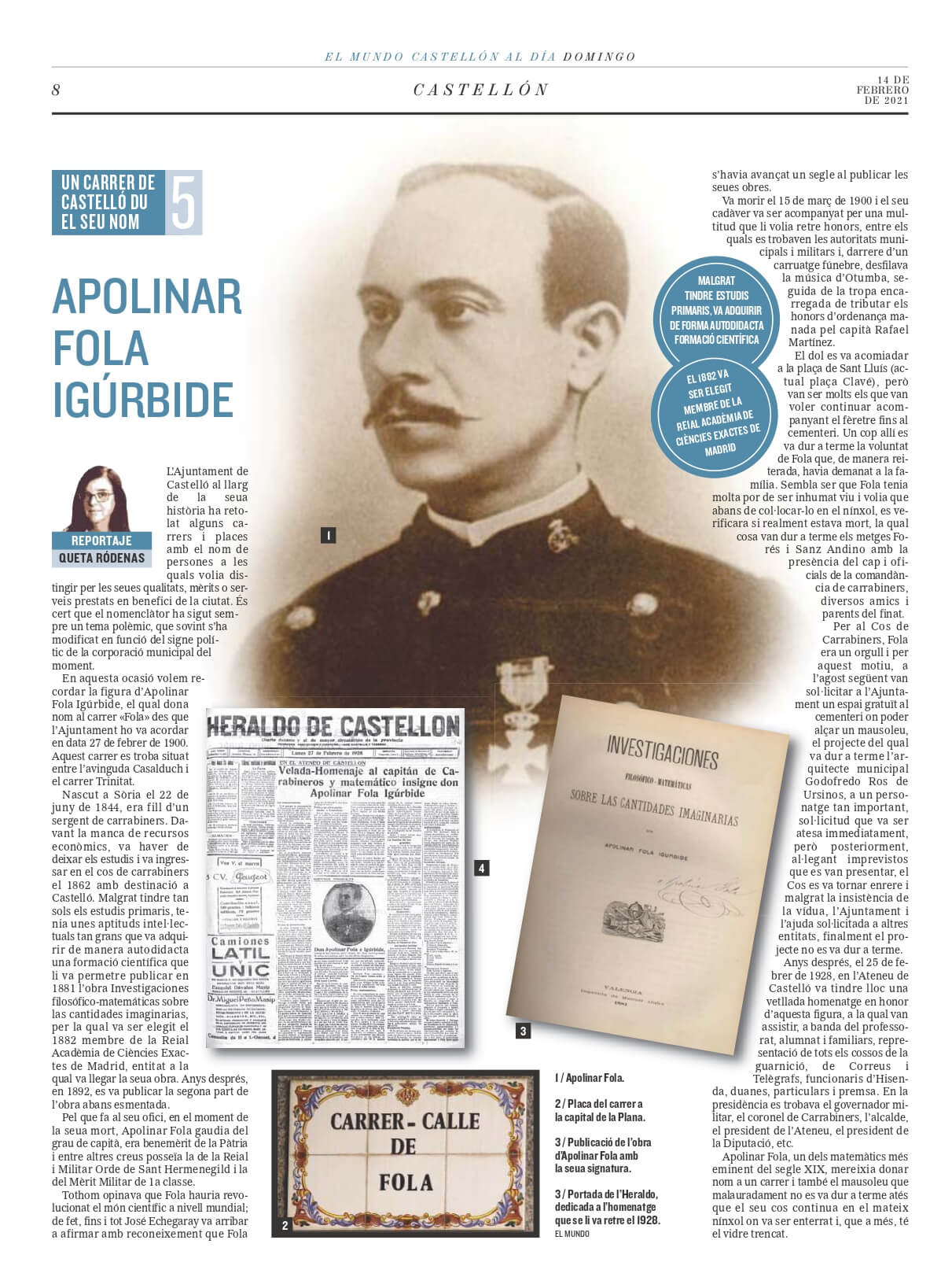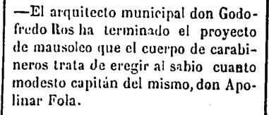 Militar y matemático, Apolinar Fola Igúrbide tiene el extraño honor de que su apellido dé nombre a una calle de Castellón previamente a su fallecimiento. Tres semanas antes de morir el 15 de marzo de 1900, en concreto el 27 de febrero, el pleno del Ayuntamiento de Castellón decide concederle dicho honor. Después, el Cuerpo de Carabineros al que pertenece el finado decide pedir al consistorio un espacio gratuito en el cementerio para instalar un mausoleo que se encarga al arquitecto municipal, Godofredo Ros de Ursinos. En junio, como recoge Diario de Castellón anuncia que el proyecto está terminado para honrar al «sabio cuanto modesto capitán» Fola.