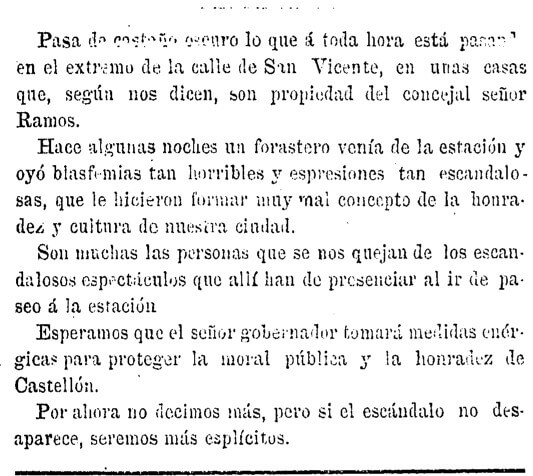 Los lectores de la revista católica La Verdad , habituados a sus habituales diatribas sobre la masonería, se encuentran a mediados de junio de 1890 con una denuncia cuyo lenguaje eufemístico apenas permite entrever un negocio de prostitución. «Pasa de castaño oscuro», dice el periódico, lo que sucede en unas casas del «extremo de la calel San Vicente» propiedad «según nos dicen» del edil Francisco Ramos Prades. Se habla del caso de un forastero procedente de la estación que, «hace algunas noches» escuchó «blasfemias tan horribles y expresiones tan escandalosas» que le hicieron concebir un «muy mal concepto de la honradez y cultura de nuestra ciudad». Y asimismo, se cuenta que «son muchas las personas» que se quejan por los «escandalosos espectáculos» que se observan «al ir de paseo a la estación», por lo que se pide al gobernador «medidas enérgicas para proteger la moral pública».