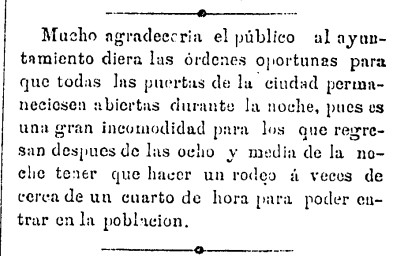 Pocos años antes del derribo de las murallas de la capital de la Plana, superada la tercera Guerra Carlista, el semanario El Clamor se erige en 1880 en portavoz del «público» al solicitar al Ayuntamiento de Castellón que dé «las órdenes oportunas para que todas las puertas de la ciudad permaneciesen abiertas durante la noche», ante la «gran incomodidad» que supone su cierre para todos aquellos que regresan «después de las ocho y media de la noche». El cierre, al parecer, les obliga a «hacer un rodeo a veces de cerca de un cuarto de hora» para acceder a la población.