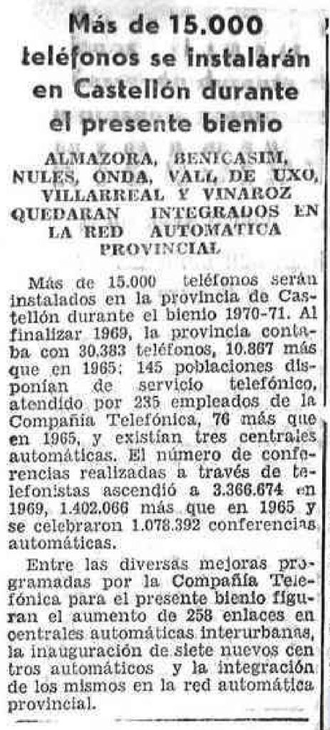 Con una poblacion que en 1970 alcanza los 385.000 habitantes, la provincia de Castellón vive años de intenso crecimiento (diez años antes son 339.000 y una década después serán 430.000 vecinos). Uno de los índices de su desarrollo es el aumento del número de abonados a la red de Telefónica. A mediados de junio de 1970, Mediterráneo recoge la cifra de los 30.383 teléfonos instalados en la provincia al acabar el años anterior, nada menos que 10.867 más que cuatro años antes. La previsión de la compañía pasa por instalar otros 15.000 antes de finalizar el año siguiente.