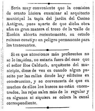 Godofredo Ros de Ursinos Calduch es arquitecto municipal de la capital de la Plana durante casi medio siglo y como tal, es objeto de atención por la prensa. Como muestra, un doble botón de mediados de junio de 1880 en El Clamor, que pone deberes al creador de espacios como la plaza de la Paz, el Teatro Principal (1894) o la iglesia de la Sagrada Familia (1900) entre otros. El primero, referido al mal estado de una tapia del jardín del Casino Antiguo, cuyo estado «ruinoso» es «un peligro permanente para los transeúntes». El segundo, para recomendarle «algún paseíto por las calles donde hay edificios en construcción», para detectar ciertas irregularidades que observa el periódico.