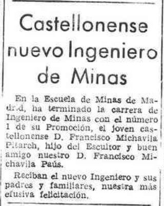 El domingo 21 de junio de 1970, Mediterraneo anuncia que el hijo del escultor «y buen amigo nuestro» Francisco Michavila Paús ha terminado la carrera de Ingeniería de Minas «con el número 1 de su promoción». El protagonista de la noticia es Francisco Michavila Pitarch, que en 1991 se convertirá en el rector fundador de la Universitat Jaume I, cargo que ostentará hasta 1993.