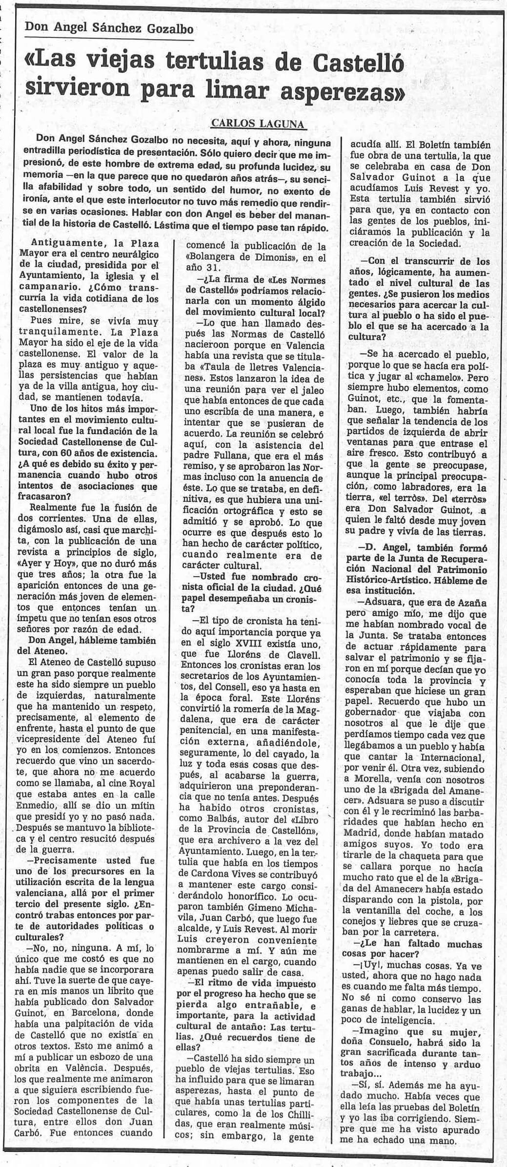 El nombre de Ángel Sánchez Gozalbo lleva ya seis años en el callejero de su ciudad natal cuando es entrevistado por Carlos Laguna para Mediterráneo en junio de 1985. Médico y escritor, el más joven de los fundadores de la Sociedad Castellonense de Cultura rememora los orígenes de la misma como resultado de «la fusión de dos corrientes», una «casi marchita» propiciada por la revista local Ayer y hoy a comienzos del siglo XX y otra, «la aparición entonces de una generación más joven de elementos que entonces tenían un ímpetu que no tenían esos otros señores por razón de edad».