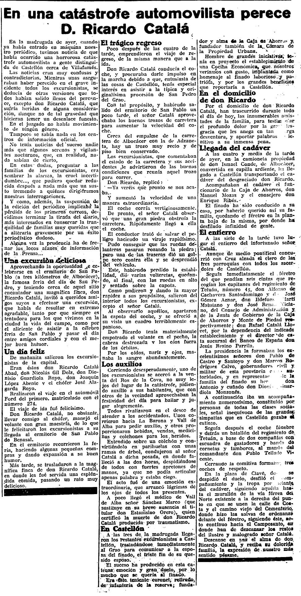 El periódico aporta numerosos detalles -incluso muy escabrosos- del accidente que causa la muerte de Catalá, que conduce el vehículo de regreso de «un día feliz» de excursión a Sant Pau de Albocàsser y tratando de llegar al Grao de Castellón a tiempo de asistir a la procesión general de las fiestas de Sant Pere. La noticia se completa con los datos del funeral y posterior entierro del finado.
