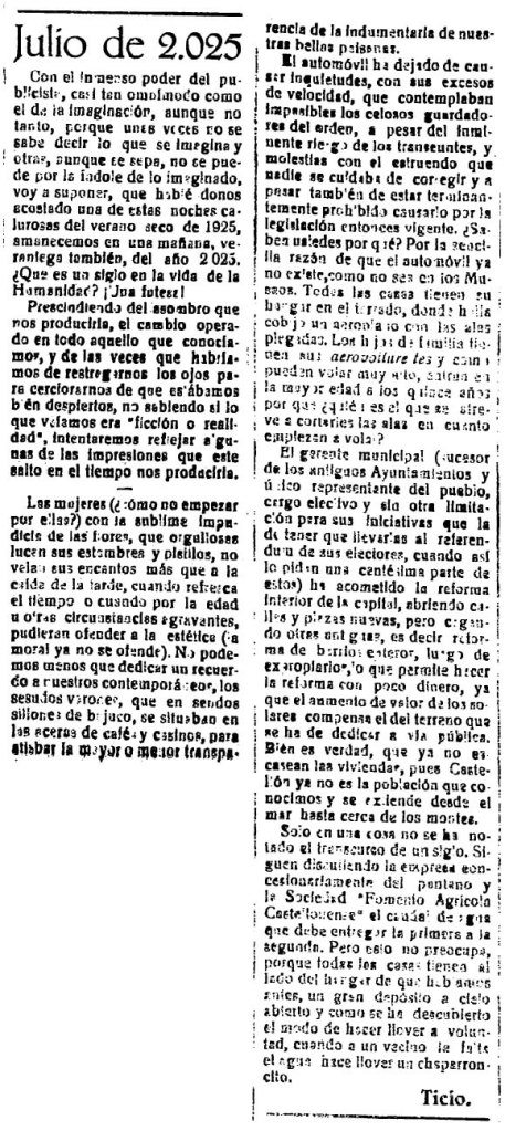 A primeros de julio de 1925, Heraldo de Castellón publica un artículo bajo el llamativo título Julio de 2025 y con la firma de Ticio. Tras el seudónimo se oculta Alfonso Blanco, quien dedica el texto a lanzar augurios sobre cómo serán las cosas un siglo después. Admite para empezar que habría «un cambio en todo aquello que conocíamos» y dificultades para distinguir realidad y ficción.