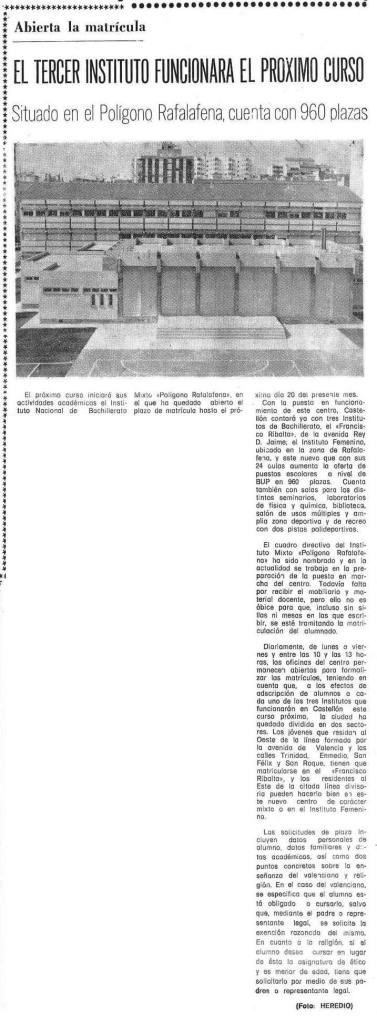 En los primeros días de julio de 1980, Mediterráneo informa sobre la apertura del periodo de matrícula en el tercer instituto de la capital de la Plana, aún sin haber recibido su nombre, que tomará del científico castellonense Vicent Sos Baynat. Denominado provisionalmente Instituto Nacional de Bachillerato Mixto Polígono Rafalafena, Anunciada su puesta en marcha para «el próximo curso», 1980-81 con 960 plazas, se sitúa justo al lado del segundo centro de este tipo en la ciudad, el Instituto Femenino -después IES Penyagolosa-, abierto en 1963 en las instalaciones del instituto Francisco Ribalta y que desde el curso 1968-69 se instala en su actual emplazamiento de la calle Moncofa.