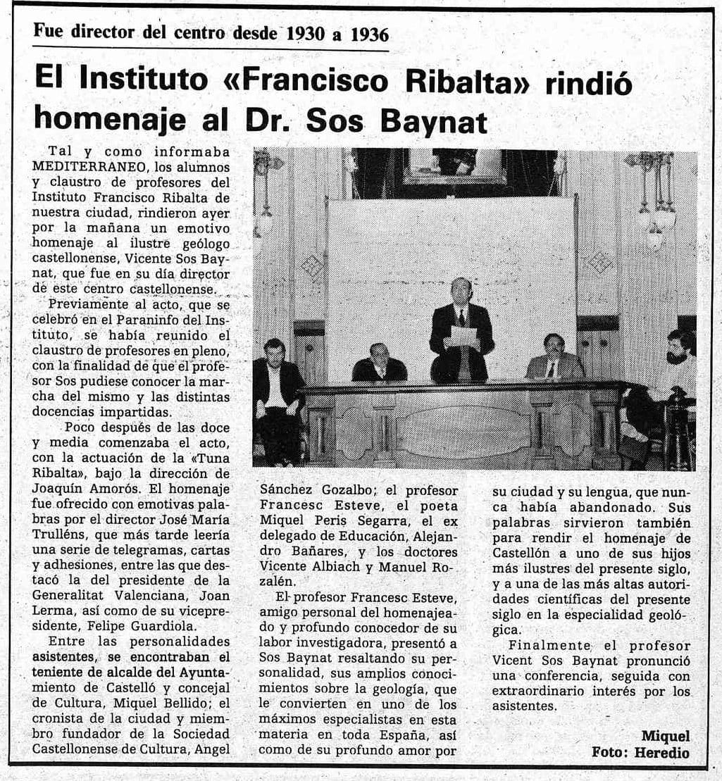 Tres años más tarde, el 27 de mayo de 1983, el propio geólogo Sos Baynat recibirá un homenaje en el instituto Ribalta, del que fue director entre 1930 y 1936: