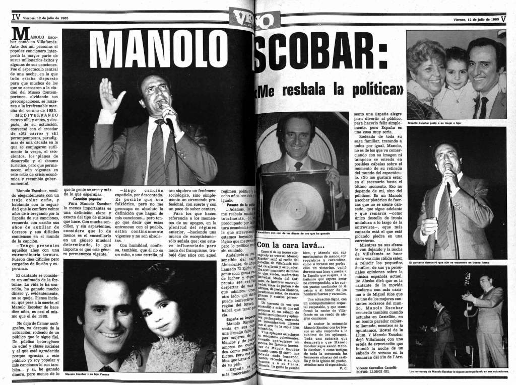 El verano es propicio para los conciertos en los pueblos de costa e interior. En el de 1985, está de gira el popular Manolo Escobar, símbolo de la música popular española del momento, y con su música llega a mediados de julio a Vilafamés, donde canta ante 2.000 personas. Vicente Cornelles le hace una entrevista para Mediterráneo con fotos de Longi Gil. En ella, además de decir que la política le tiene «sin cuidado», desliza opiniones sin regatear elogios sobre otros artistas del momento como Alaska o Miguel Ríos y rememora su paso por el Hostal de la Llum en la capital de la Plana, bajo la dirección de Salvador Bellés.