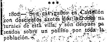En sus efemérides del 19 de julio de 1930, el Diario de la Mañana publica el castigo al que se ven condenados dos ladrones «naturales de esta villa» en la misma fecha del año 1800, a finales del siglo XVIII: doscientos azotes y el paseo a lomos de un pollino «por toda la población», para su escarnio público.