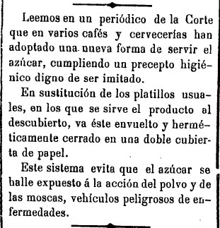 Con el tono sorprendido de la novedad, Heraldo de Castellón informa a sus lectores en julio de 1905 sobre lo que sus redactores han leído «en un periódico de la Corte». Nada menos que «una nueva forma de servir el azúcar, cumpliendo un precepto higiénico digno de ser imitado» vista en «varios cafés y cervecerías» de Madrid. El diario explica que la invención viene a sustituir a «los platillos usuales, en los que se sirve el producto al descubierto». En el nuevo método el azúcar va «envuelto y herméticamente cerrado en una doble cubierta de papel», lo que evita el efecto dañino de la acción del polvo y de las moscas, «vehículos peligrosos de enfermedades».