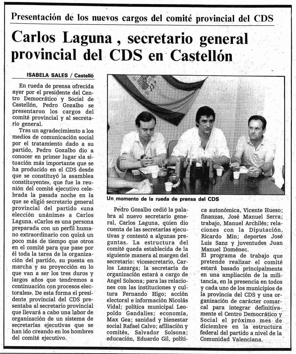 Una rueda de prensa de Pedro Gozalbo, presidente del Centro Democrático y Social (CDS) en Castellón, sirve para presentar a los nuevos cargos del comité provincial del partido. Con el fondo de una bandera nacional, se anuncia el nombramiento del periodista y ex gerente del CD Castellón, Carlos Laguna Asensi (32 años), como nuevo secretario general de la formación dirigida por el expresidente del Gobierno Adolfo Suárez. Después de esta etapa, en la que llegará a ser diputado autonómico, será presidente de COCEMFE Castellón y también en la Comunitat Valenciana, así como presidente -desde 1999, sus diez primeros años- y vicepresidente del Comité Español de Representantes de Personas con Discapacidad (CERMI) a nivel autonómico. En 2019 se incorporará como independiente a la candidatura autonómica por Castellón del PSPV-PSOE -partido en el que ya militó entre 1977 y 1980- y obtendrá un escaño en las Cortes Valencianas que abandonará en 2023, el mismo día en que cumpla 70 años.
