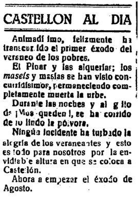 El final del mes de julio, con la doble festividad el día 25 de Santiago Apóstol y San Cristóbal, patrón de la capital de la Plana, supone «el primer éxodo del veraneo de los pobres», como lo define Heraldo de Castellón en 1925. El diario se refiere a lo «muerta» que queda la urbe en detrimento del Pinar, las alquerías y los masets y pone de relieve el papel de la pólvora en unas noches en que se repite el grito Mos quedem! El periódico subraya finalmente la ausencia de incidentes y convoca a los castellonenses «a empezar el éxodo de agosto», en este caso en torno a la festividad de la Asunción y de San Roque.