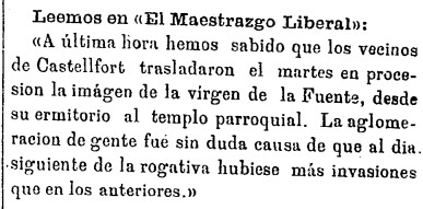En plena epidemia de cólera -la tercera del siglo XIX, tras las de 1834 y 1855- El Clamor de Castellón recoge una noticia de El Maestrazgo Liberal según la cual, «los vecinos de Castellfort» han trasladado en procesión a la Virgen de la Fuente, la Mare de Déu de la Font, «desde su ermitorio al templo parroquial». Una rogativa fuera de su fecha habitual, el 8 de septiembre, que para el periódico que la recoge provoca una «aglomeración de gente» que «fue sin duda causa de que al día siguiente (…) hubiese más invasiones [contagios] que en los anteriores».