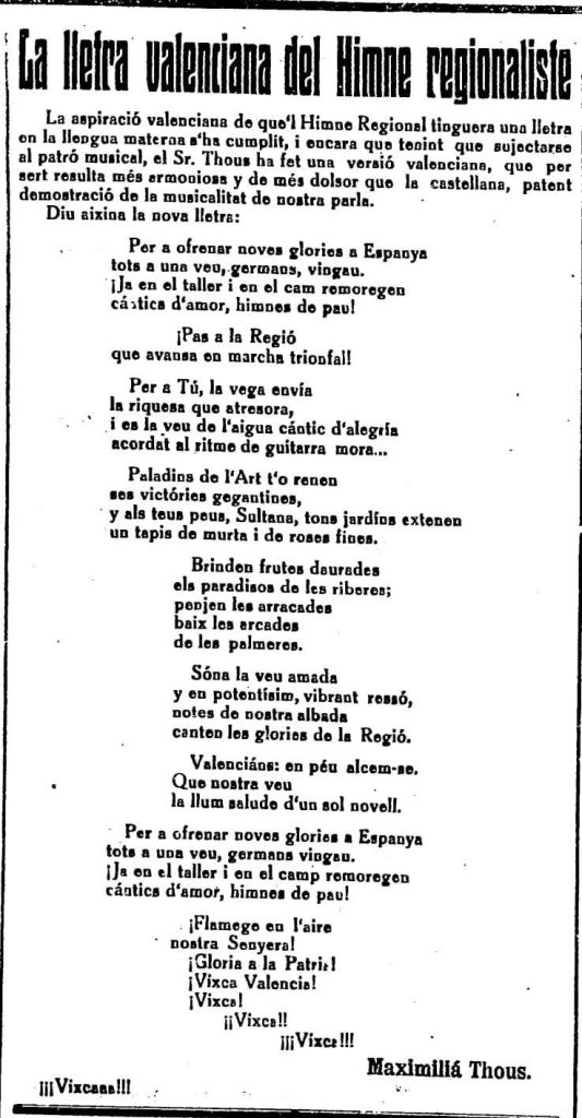 La Exposición Regional Valenciana de 1909 es el escenario en que se presenta el Himno de la Exposición, compuesto por el maestro José Serrano, al que pone letra en castellano Maximiliano Thous. Oficializado como himno regional en mayo de 1925, con el beneplácito de los alcaldes de las tres capitales valencianas en 1925 -por Castellón, Salvador Guinot-, no será hasta 1930 cuando el Ayuntamiento de Valencia encargue a Thous la versión en valenciano, que es cantada por vez primera en un acto de exaltación de la Senyera el 25 de julio de 1930.