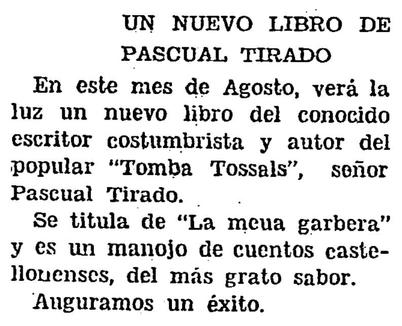 En agosto de 1935, el llaurador letraferit Josep Pascual Tirado publica De la meua garbera, presentado por Heraldo de Castellón como «un manojo de cuentos castellonenses del más grato sabor», al que el periódico augura éxito. Cinco años antes, el autor ha dado a la Imprenta Armengot Tombatossals, que recibe un galardón de la Cámara Oficial del Libro de Madrid a la mejor edición del año. Nacido en una familia de agricultores acomodados -los Mirona-, concejal entre 1931 y 1936 y miembro de la Societat Castellonenca de Cultura, Pascual Tirado se forma como escritor guiado por Ricard Carreras Balado y fallecerá a los 52 años, el 1 de enero de 1937.