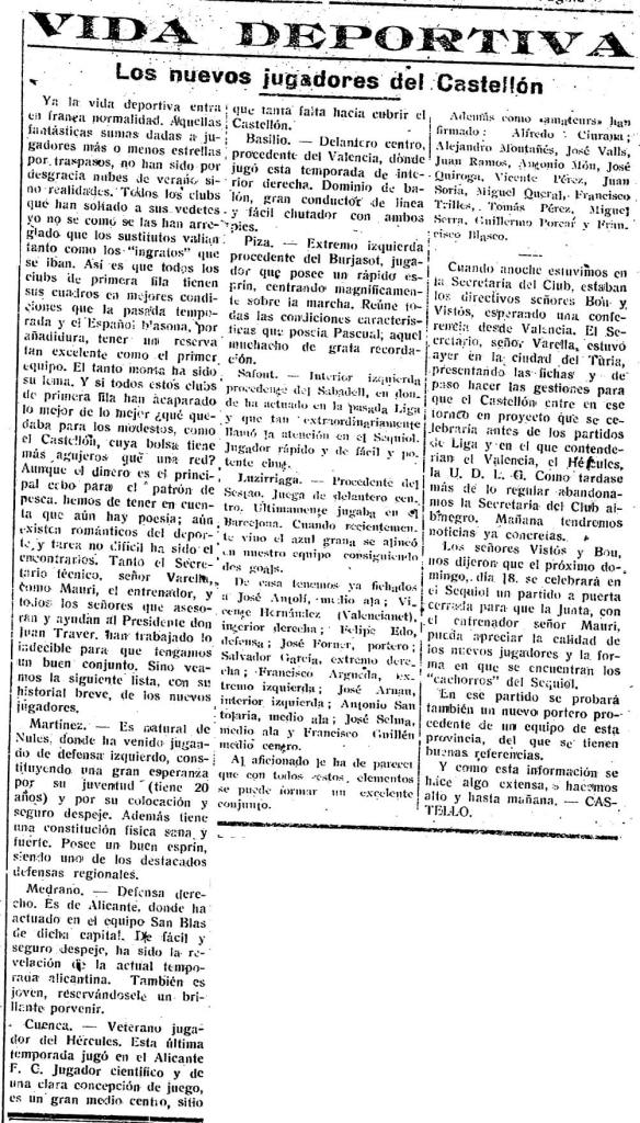Entre los fichajes más destacados, brilla con luz propia el que se convertirá con el tiempo en el máximo goleador histórico del CD Castellón, Basilio Nieto, a quien se describe como «delantero centro, procedente del Valencia, donde jugó esta temporada de interior derecha. Dominio de balón, gran conductor de línea y fácil chutador con ambos pies». Asimismo, se destaca al «extremo izquierda procedente del Burjasot» Vicente Pizá, de quien se resalta su «rápido esprín» y la capacidad de centrar «magníficamente» sobre la marcha. En el inicio de una temporada tan importante, también se alaban las cualidades del nulense Miguel Martínez, a quien se sumará en breve su paisano, el portero Antonio Pérez.