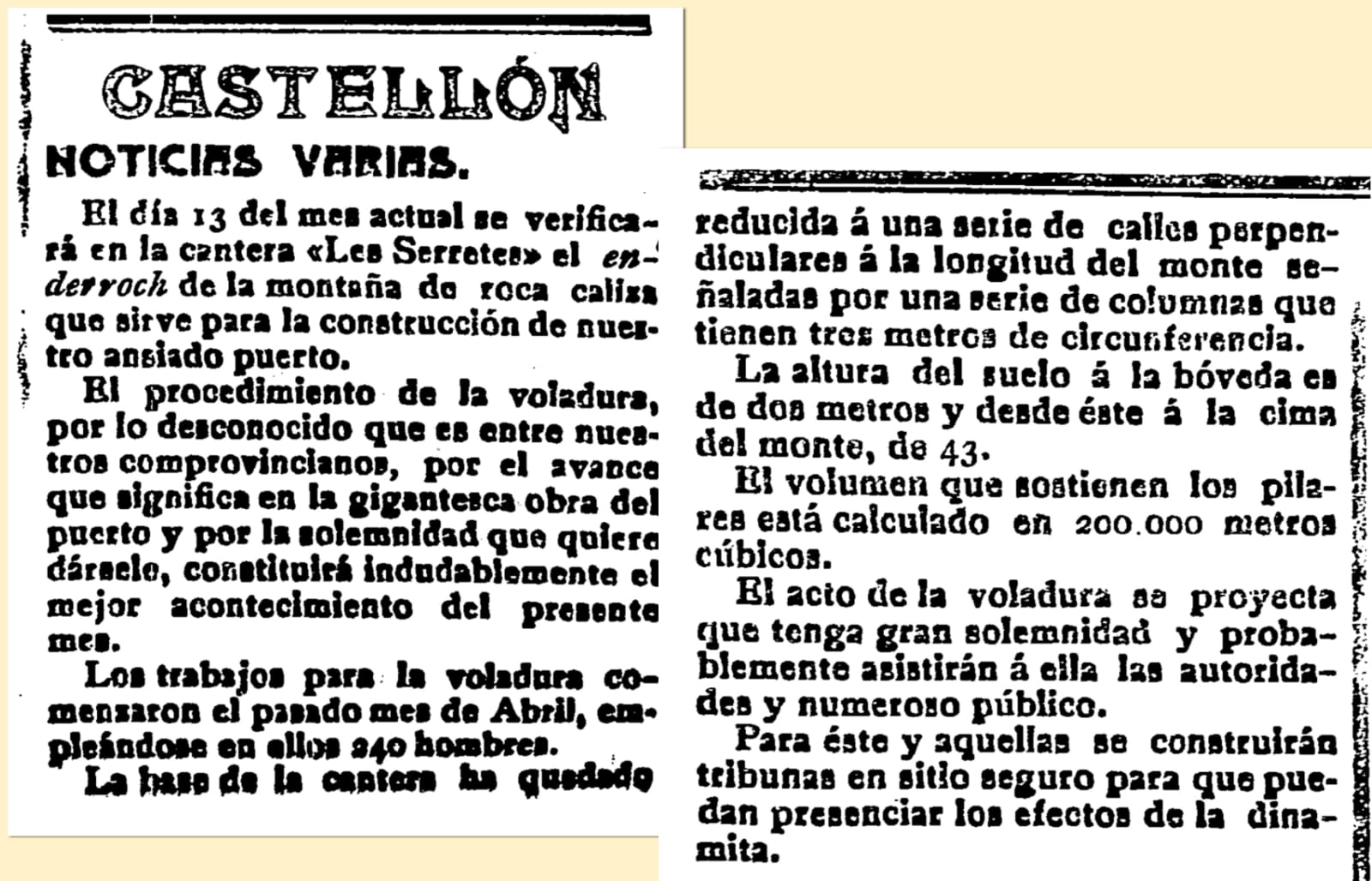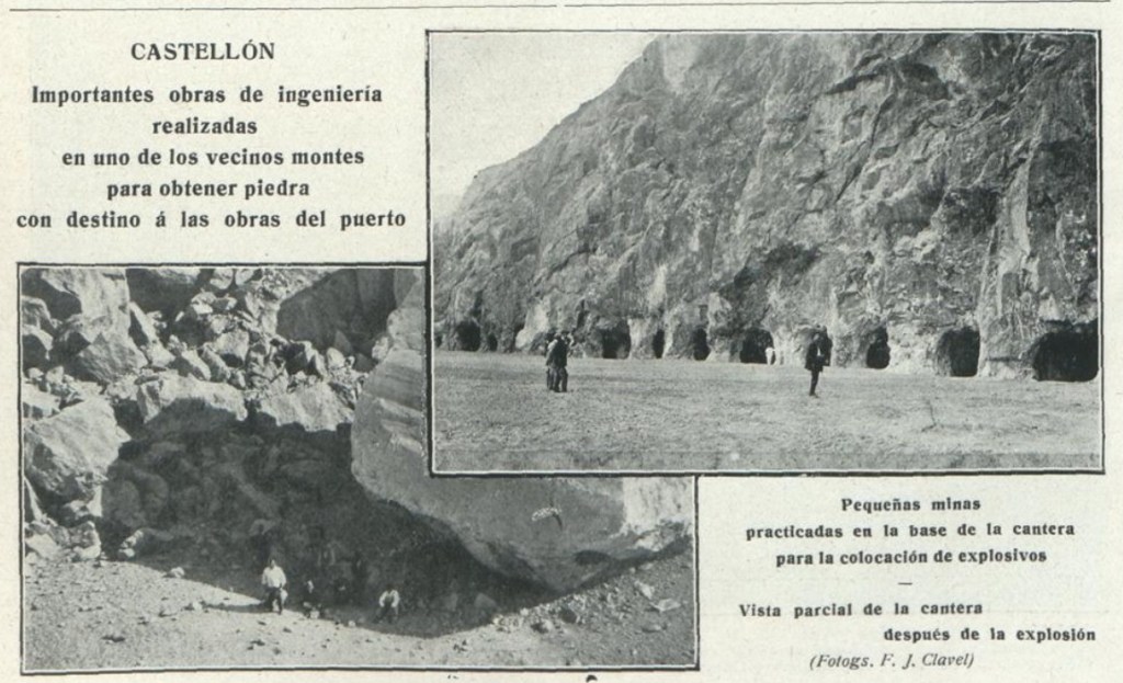 A los lectores de Heraldo de Castellón, el diario les anuncia a comienzos de agosto de 1910, para el sábado 13, «el mejor acontecimiento» del mes: el enderroch o derribo de una montaña de roca caliza en la cantera de Les Serretes, «que sirve para la construcción de nuestro ansiado puerto». Los atractivos son el procedimiento de la voladura, «el avance que significa en la gigantesca obra del puerto» y finalmente, «la solemnidad que quiere dársele». Se cuenta que 240 hombres han trabajado en los preparativos desde el mes de abril: