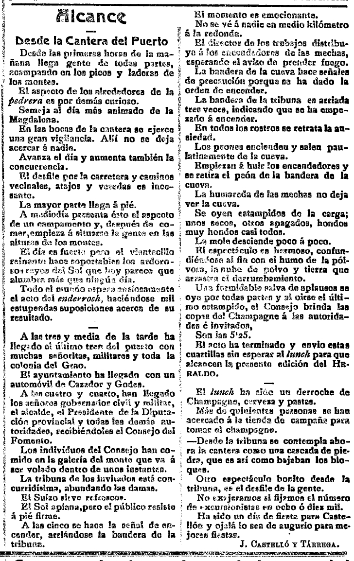 Llegado el gran día, será el propietario y director del periódico, José Castelló y Tárrega, quien firme un «alcance» desde la propia cantera, con todos los pormenores de la esperada jornada. Explica que la mayoría del público llega a pie y a mediodía «presenta esto el aspecto de un campamento». Detalla que hay hasta una «tribuna de invitados» y que «el Suizo sirve refrescos». Relata después la emoción del momento culminante y cómo «se oyen estampidos de la carga; unos secos, otros apagados, hondos muy hondos casi todos», tras los cuales «la mola desciende poco a poco». El colofón es un lunch con «derroche de Champagne, cerveza y pastas».