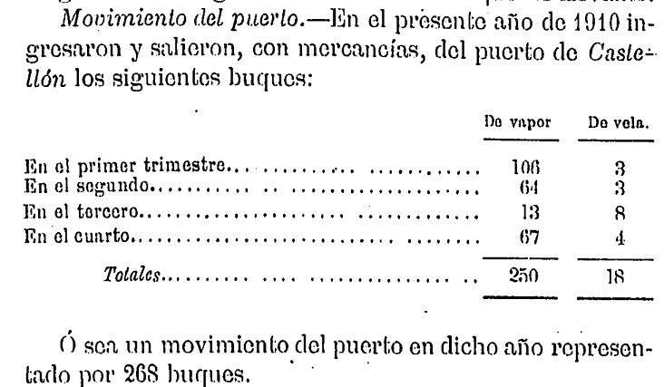 Cabe señalar que en ese momento, el Puerto de Castellón se encuentra en su etapa inicial, presentando esta actividad en el ejercicio anterior, en 1909, según se recoge en este artículo firmado por B. Donnet en el número 1.838 de la Revista de Obras Públicas: