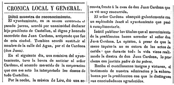 Con el periódico repleto de noticias sobre el azote del cólera, en el verano de 1885 El Clamor de Castellón recoge la noticia de la decisión adoptada el jueves 20 de agosto por el Ayuntamiento de la capital de la Plana, por la que se nombra «por unanimidad» como nuevo Hijo Predilecto de la ciudad al «digno y honrado sacerdote don Juan Cardona, arcipreste que fue de esta ciudad», al tiempo que se da su nombre a la llamada calle del Agua. Al día siguiente del pleno municipal, una comisión de concejales «tuvo la honra de noticiar al señor Cardona, el acuerdo merecido de la corporación». El diario detalla cómo la banda de La Lira da una serenata frente a la casa del sacerdote y benefactor castellonense. Además, El Clamor subraya que «la opinión, a pesar de que la mano izquierda no se entera de los actos de caridad que durante toda la vida viene realizando la diestra» de Juan Bautista Cardona Vives, «lo proclama con justicia padre de los pobres«.