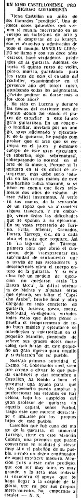 «Con sus doce años escasos» se presenta Manuel Cubedo Alicart a los lectores de Mediterráneo a través de una carta al director, por esos años Jaime Nos. Cubedo es un «prodigioso guitarrista» según la misiva remitida al periódico por N. N., quien elogia a Manolín como «un torbellino de arte», tras conocerlo en las fiestas de Llucena. Además de su habilidad con la guitarra, el niño estudia por entonces quinto de violín, «guardando para los ratos de ocio el estudio del bachiller». El resultado de su interpretación suena al autor del artículo como «soberbio, algo sobrenatural» y celebra que el Gobierno Civil haya otorgado una ayuda de estudios a la joven promesa.