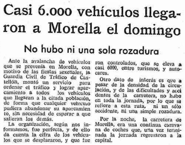 La cuadragésimo sexta edición del Sexenni de Morella atrae a la capital de Els Ports a miles de visitantes a finales de agosto de 1970. El domingo 23, en concreto, se espera una «avalancha de vehículos» que lleva a la Guardia Civil de Tráfico a organizar un dispositivo «para ordenar el tráfico y lograr aparcamiento a todos los vehículos que llegaran». Se cifra en «casi 6.000» el número de los mismos, entre turismos y autocares. «Ni un solo accidente, ni una simple rozadura» es el balance de la jornada, según recoge el corresponsal de Mediterráneo, Francisco Luis Blasco.