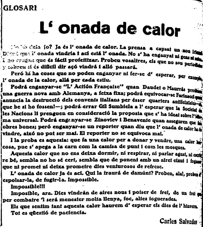 El Glosari del poeta y gramático Carles Salvador se convierte en una sección habitual de la prensa castellonense en los años 20. Mediada la década, en agosto de 1925, Diario de Castellón publica este artículo suyo sobre la ola de calor, una de las cosas «que no poden enganyar ni fer-se d’esperar» cada verano. Salvador subraya que hace un calor «per a donar i vendre», que «s’apega a la carn com la camisa de punt i com les mosques», con una temperatura «que no ens deixa dormir, ni respirar, ni parlar a gust», destacando que augurar una ola de calor es apostar sobre seguro. El autor invita a esperar la llegada del invierno: «tot és qüestió de paciència».