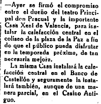 Avanzado el año 1930 y en plena preparación del nuevo curso teatral, Heraldo de Castellón anuncia la inminente instalación de la calefacción central en el coliseo «a fin de que el público pueda disfrutar en la temporada próxima, de tan necesaria mejora». El compromiso es firmado con «la importante Casa Xení de Valencia» por el propietario del teatro, «don Pascual» -con toda probabilidad, Ramón Pascual Feltrer, casado con Clorinda Cebrián Prades, heredera del primer dueño particular, Juan Cebrián. Además, la noticia avanza la próxima incorporación de esta misma novedad a dos edificios de la Puerta del Sol: el Banco de Castellón y el Casino Antiguo, en este último caso «de una manera parcial».