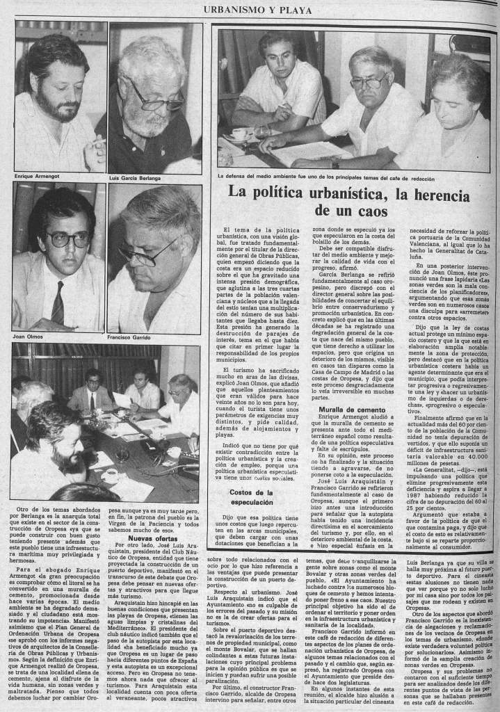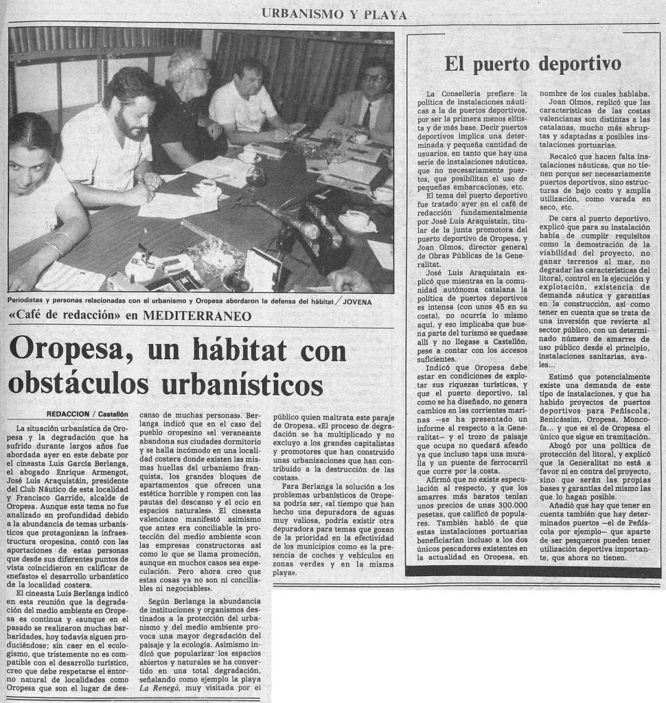 En el último día de agosto de 1985, Mediterraneo publica el resultado de un Café de redacción sobre el estado del urbanismo y el turismo en Oropesa del Mar, en el que participan varias personalidades vinculadas a la localidad: son el abogado Enrique Armengot; el presidente del Club Náutico de Oropesa, José Luis Araquistáin; el alcalde Francisco Garrido… y un veraneante muy especial: el cineasta Luis García Berlanga, quien ese mismo año acaba de estrenar con gran éxito La vaquilla.