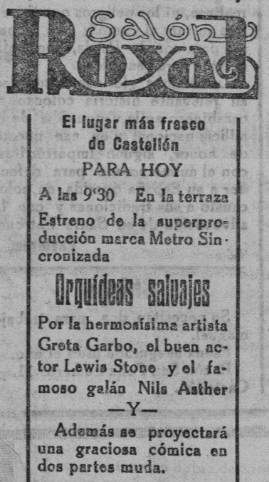 En los estertores del verano de 1930, el Salón Royal se promociona en Heraldo de Castellón como «el lugar más fresco» de la ciudad, utilizando así el atractivo de la temperatura como reclamo para atraer espectadores. Inaugurado en 1921 por Vicente Renau Torrent en el lugar donde había estado la Posada de la Estrella (calle González Chermá, hoy Enmedio), hace solo unos meses que ha empezado a proyectar películas en versión sonora, con gran éxito de público. En septiembre, en concreto, el estreno de Orquídeas salvajes con la «hermosísima» Greta Garbo, Lewis Stone y Nils Asther.