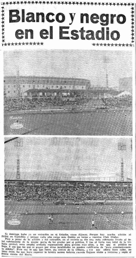 Bajo el título Blanco y negro en el Estadio, la sección de Deportes de Mediterraneo avisa en septiembre de 1970 sobre la diferencia de aspecto general de la grada de Castalia en el primer partido de la temporada de la Liga de Segunda División, saldado con victoria del CD Castellón por 2-1 contra el Racing de Santander. El periódico destaca el «entradón» registrado en el estadio «porque cada año surge más ilusión» en torno al club. El contrapunto es «el vacío casi total de la tribuna central, una amplia zona acotada seguramente para precios más altos, a los que el público no llega».
