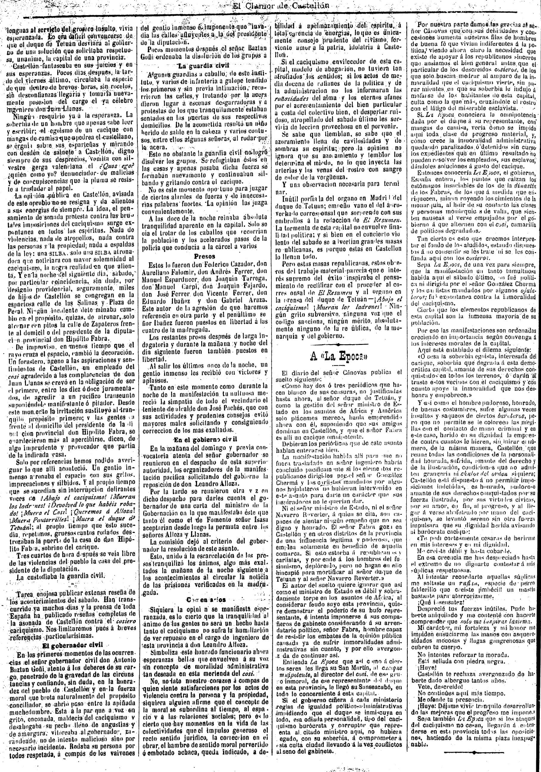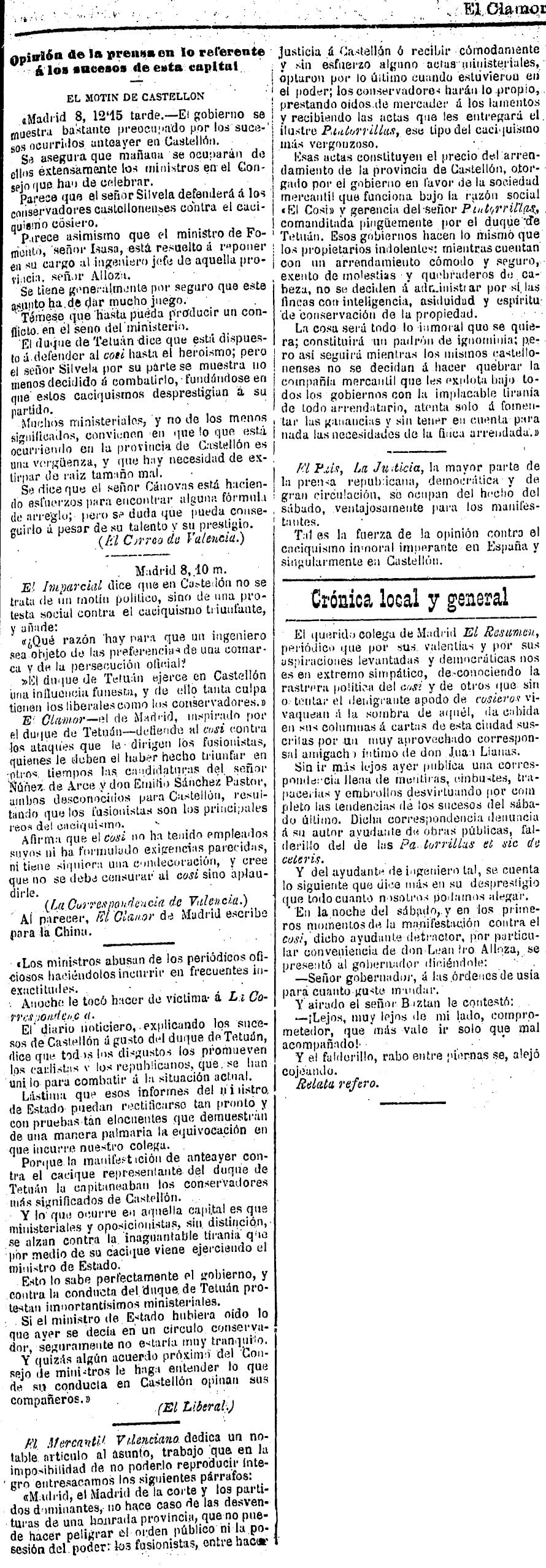 Pocos días antes, en agosto, ha sido nombrado ingeniero jefe de Caminos, Canales y Puertos de Castellón, pero dos días después, su nombramiento es revocado y se decide su traslado a Tarragona. No obstante, su sustituto –Juan Llanas– solo dura unos meses en el cargo, puesto que la presión ciudadana logrará el retorno de Alloza a fin de año. El 11 de septiembre, el republicano El Clamor de Castellón destaca la dimensión de la movilización popular del día 6 y las reacciones políticas, que alcanzan el ámbito nacional, con protagonismo del segundo duque de Tetuán, Carlos O’Donnell, líder nacional del Partido Conservador que en Castellón tiene como líder a Victorino Fabra Gil, cabecilla del Cossi que domina la política provincial. El periódico habla abiertamente de «motín» para referirse al carácter de la manifestación en defensa de Alloza: