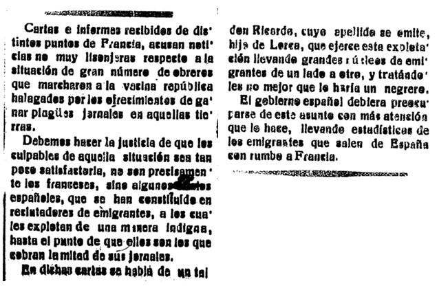 La edición de El Clamor del segundo lunes de septiembre de 1915 da cuenta de «cartas e informes» llegados de Francia en los que se refieren malas noticias de «gran número de obreros que marcharon a la vecina república halagados por los ofrecimientos de ganar pingües jornales en aquellas tierras». La culpa no es de los franceses, sino de «algunos cuantos españoles que se han constituido en reclutadores de emigrantes, a los cuales explotan de una manera indigna, hasta el punto de que ellos son los que cobran la mitad de sus jornales». Apunta el periódico a «un tal don Ricardo», de Lorca (Murcia), quienes trataría a las víctimas «no mejor que lo haría un negrero». El diario insta al Gobierno español a «preocuparse de este asunto con más atención que lo hace».