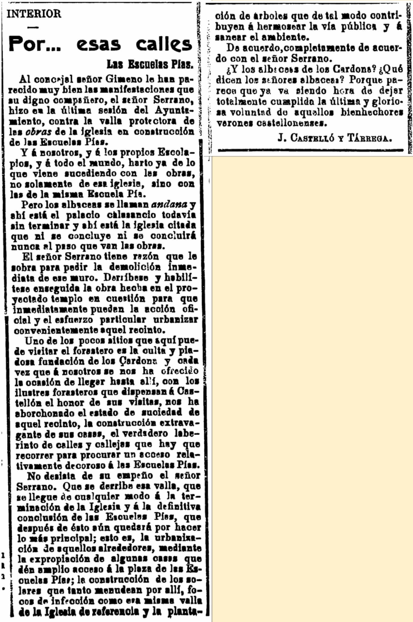 Se apela a la voluntad de los albaceas de la familia del sacerdote y benefactor Juan Bautista Cardona Vives, con los fondos de cuyo legado se llevan a cabo ambas obras. El periódico va más allá: «que se derribe esa valla, que se llegue de cualquier modo a la terminación de la Iglesia y a la definitiva conclusión de las Escuelas Pías, que después de esto quedará por hacer lo más principal; esto es, la urbanización de aquellos alrededores, mediante la expropiación de algunas casas que den amplio acceso a la plaza de las Escuelas Pías», para eliminar «el verdadero laberinto de calles y callejas que hay que recorrer» en ese momento.