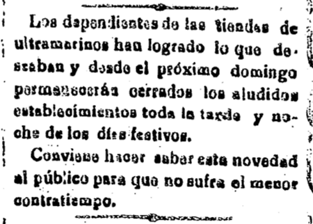 A mediados de septiembre de 1900, Heraldo de Castellón informa a sus lectores de que los dependientes de las tiendas de ultramarinos «han logrado lo que deseaban y desde el próximo domingo permanecerán cerrados los aludidos establecimientos toda la tarde y noche de los días festivos». Con el ojo puesto en los consumidores, el diario se justifica al dar a conocer «esta novedad al público para que no sufra el menor contratiempo».